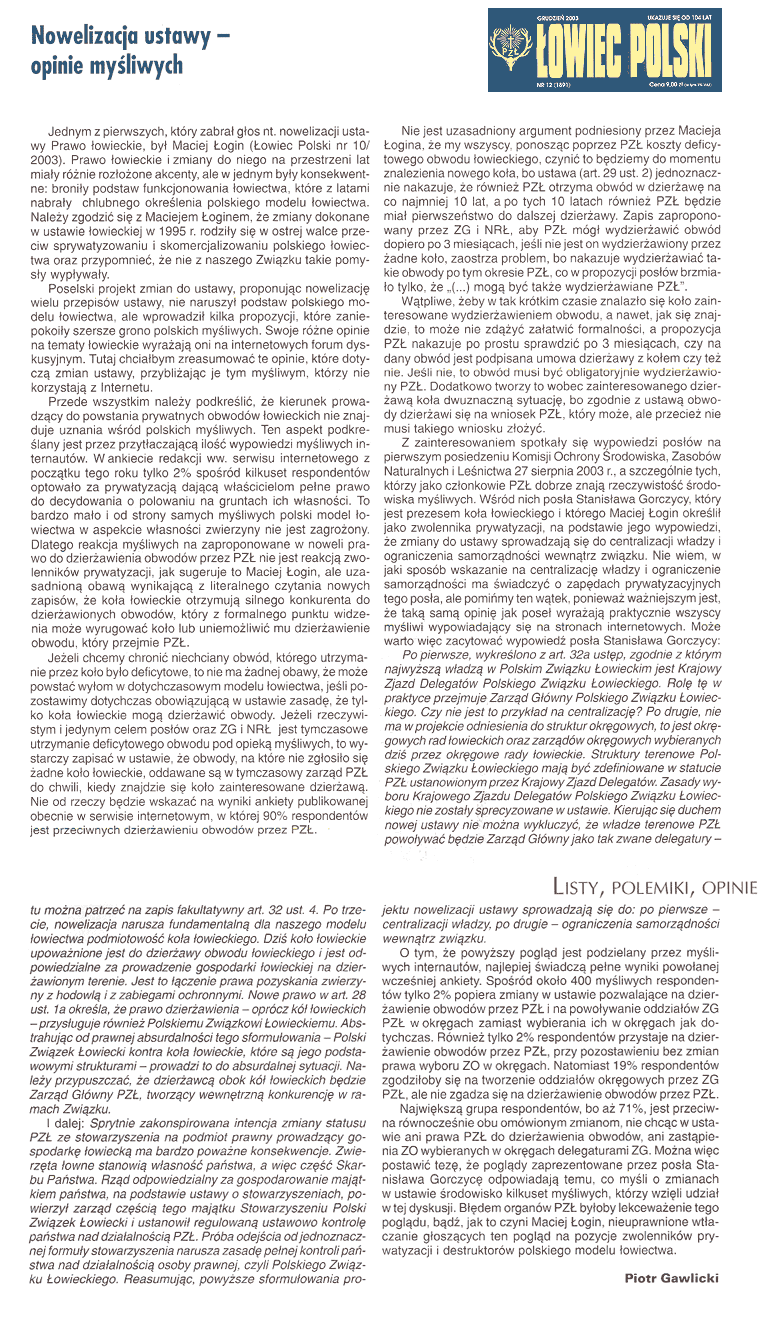 Piotr Gawlicki omawia stanowisko myśliwych wobec zmian w ustawie, na podstawie ankiety i forum serwisu, polemizując z Maciejem Łoginem (Łowiec Polski nr 12/2003)